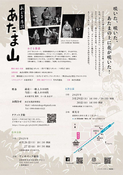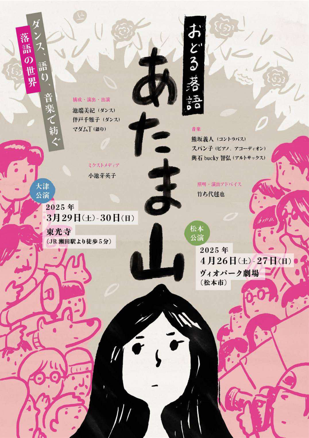 2017年立ち上げ。日常的感覚をひょいと飛び越えて、さもありなんと笑わせる落語を題材にパフォーマンスを創作。ダンサー、語り手、美術家、音楽家がお互いの領域を少しずつまたぎ越えながら、お噺の不思議をほどこうとする。